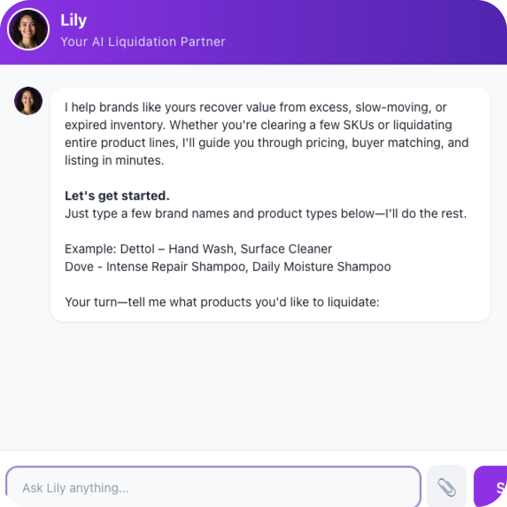 Lily AI lists & liquidates excess stock instantly — freeing space, recovering cash, and protecting your brand.