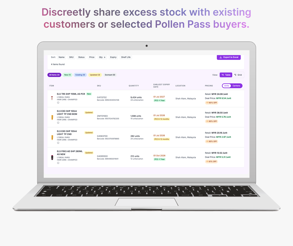 Pollen Pass connects your inventory to 500+ bulk buyers in Asia and 1,000+ global exporters. Sage AI routes stock into Marketplace or Catalogs — balancing speed and recovery with brand control.